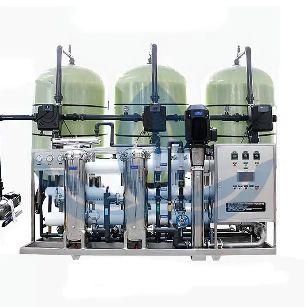 - Nước đầu vào được đưa qua hệ thống lọc thô, than hoạt tính và màng RO