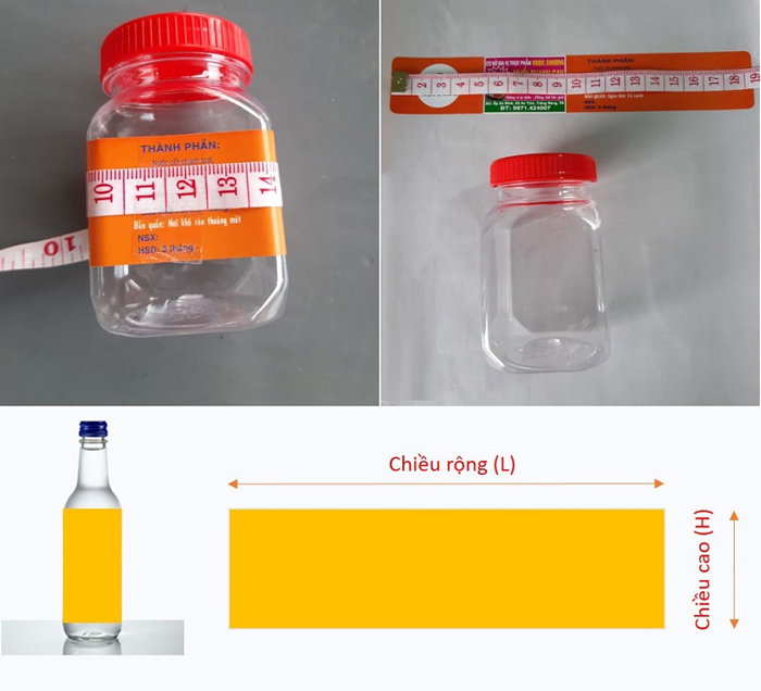 Kích thước nhãn dán chai là tập hợp các thông số kỹ thuật mô tả chiều dài, chiều cao và vùng dán của nhãn trên thân chai. Đây là cơ sở để: