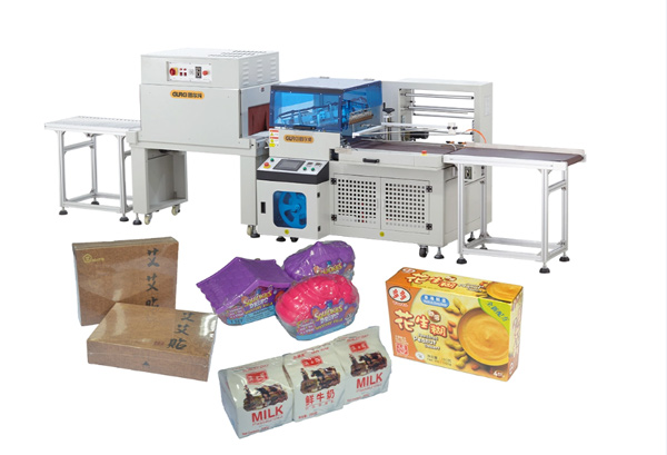 Bộ L-sealer (DQL-5545) kết hợp buồng co (tunnel) — dạng rất phổ biến cho đóng gói hộp nhỏ và trung. Thông số mẫu: sản phẩm tối đa ~550×450×140mm, năng suất ~15–25 sản phẩm/phút.