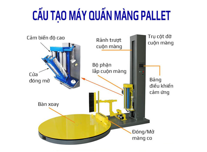 Máy quấn màng co thùng carton được thiết kế để vận hành ổn định, bảo vệ thùng hàng trong quá trình vận chuyển và nâng cao tốc độ đóng gói. Dù là bàn xoay, cánh tay xoay hay robot di động, cấu tạo chung của máy luôn gồm các bộ phận chính sau: